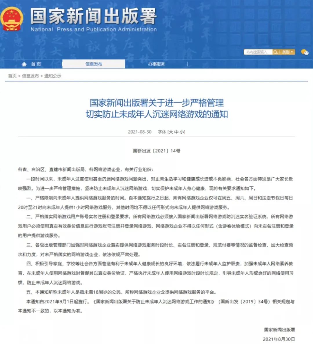 2021年8月30日,國家新聞出版署發佈《關於進一步嚴格管理切實防止未成年人沉迷網絡遊戲的通知》,俗稱“最嚴防沉迷”政策。在此之後,國內未成年玩家僅可在週五、週六、週日和法定節假日每天晚上8點到9點之間玩1小時遊戲。