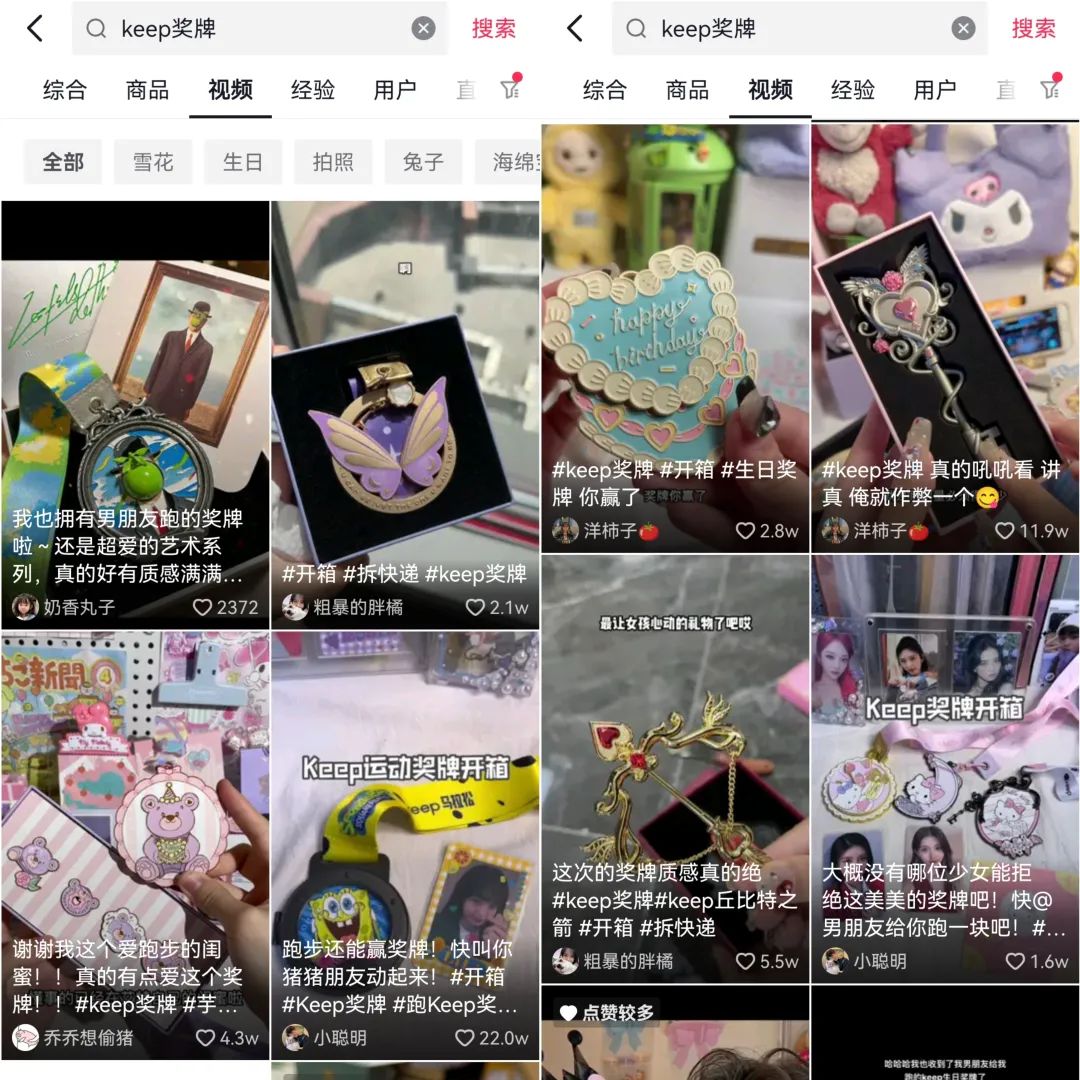 同時,在抖音上,#Keep獎牌#收穫了23.8億次播放,#Keep獎牌開箱#也有1094.9萬次播放。這些視頻中,用户們手裏拿着不同活動發放的Keep獎牌,要麼是“為自己未來女朋友跑的”,要麼是“沉浸式開箱”,以此獲得更高的流量。