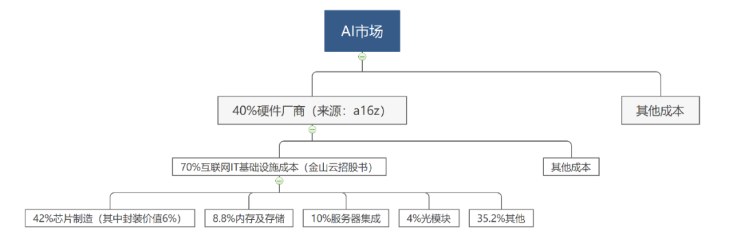如果我們將客户成本拆解,以服務器廠商毛利率10%為基數估算產業價值(全部按照AI服務器成本結構計算)。根據2021年市場銷售規模反向推算出光模塊、芯片、存儲、封裝等等在產業鏈上的價值,如下圖所示。