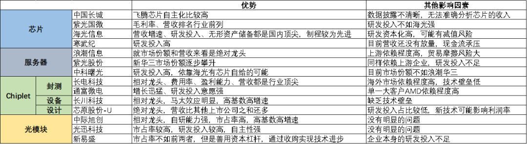 ●除芯片外,其他硬件設施不落下風,服務器、封裝、電光器件都有全球龍頭和市佔率較高的公司。