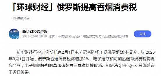 2023年3月1日開始,俄羅斯香煙消費税增加2%,電子煙液和可加熱煙草消費税提高11%,看來也開始打煙草税的主意了。