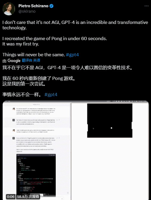代碼就不全部截圖出來了,在推特上,有人分享了GPT生成的乒乓遊戲。