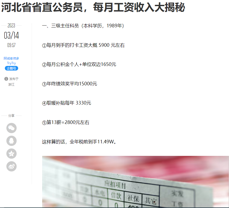 上圖來源於騰訊網,三級主任科員相當於過去的副科級(不任職),也即河北省一個縣級的副局長全年合法收入12萬左右,扣除五險一金每個月實得工資5000多塊、普通新入職科員實得4000多塊。由於網上可以輕鬆查到各種披露,對此我就不在重複贅述。以我所在的雲南為例,某被評價為“在雲南玩了十年、耽誤了雲南十年”的前省一把手主政十年裏沒加過雲南公務員的工資(2千多塊/月)。現在的雲南則已經與上圖河北的相比大體持平,所以我姑且將兩省的情況視為國內普遍情況。