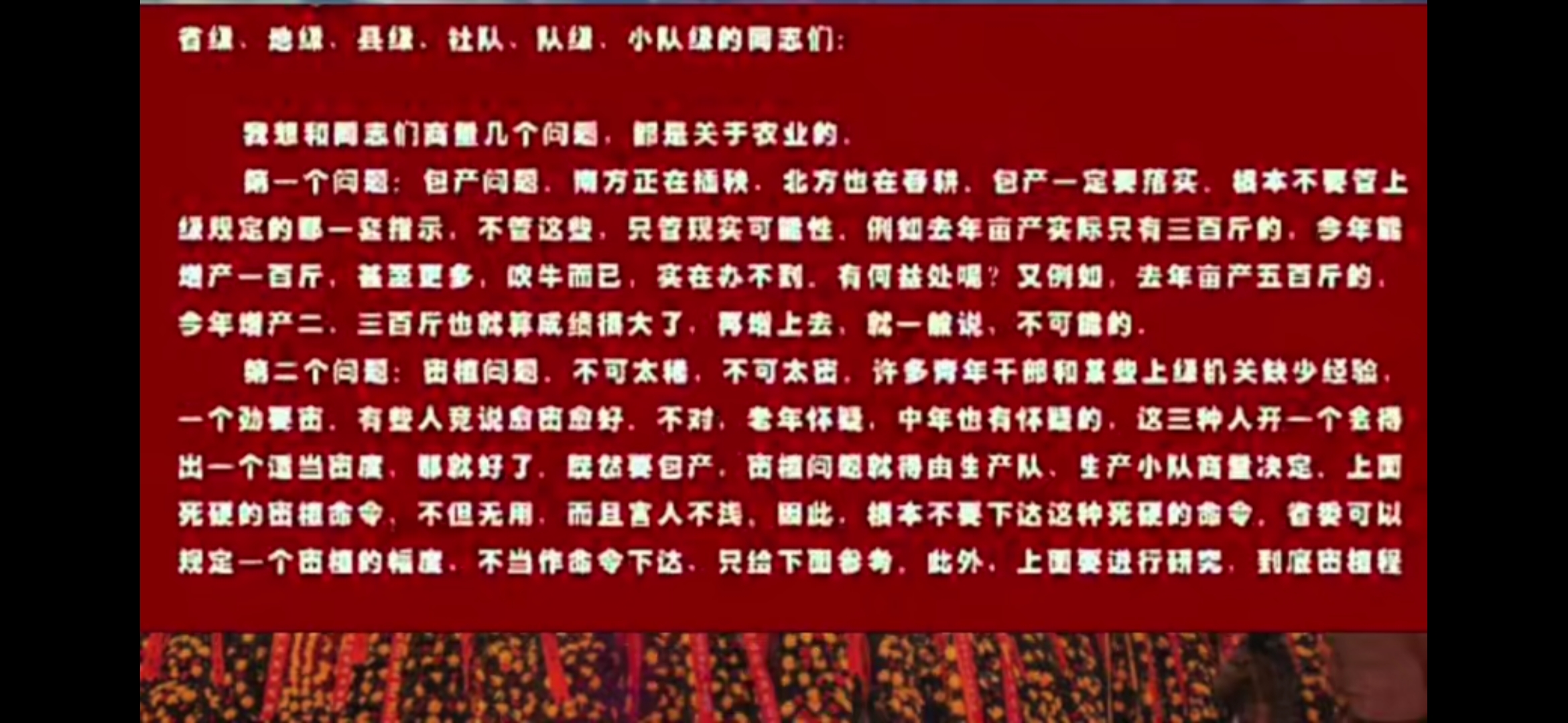 第一個問題:包產到户。南方正在插秧,北方也在春耕,包產一定要落實,根本不要管上級規定的那一套指示,不管這些,只管現實可需性,例如去年畝產實際只有三百斤的,今年能增產一百斤,甚至更多,吹牛而已,實在辦不到。有何益處嗎?又例如,去年畝產五百斤的,今年增產二,三百斤也就算成績很大了,再增上去,就一般説,不可能的。