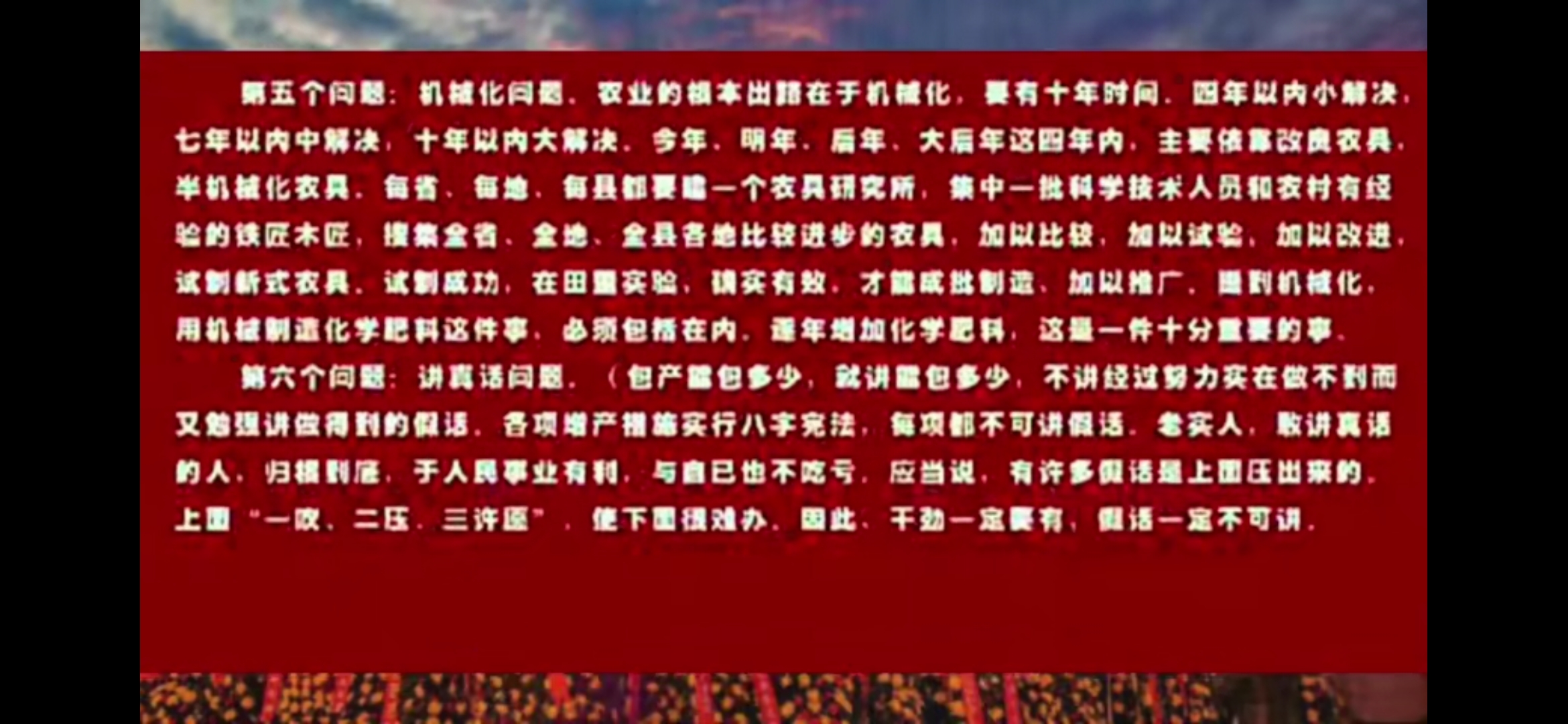 第六個問題:講真話問題。包產能包多少,就講能包多少,不講經過努力實在做不到而又勉強講做得到的假話。各項增產措施實行八字憲法,每項都不可講假話。老實人,敢講真話的人,歸根到底,於人民事業有利,與自已也不吃虧。應當説,有許多假話是上面壓出來的,上面"一吹,二壓,三許願",使下面很難辦。因此,幹勁一定要有,假話一定不可講。