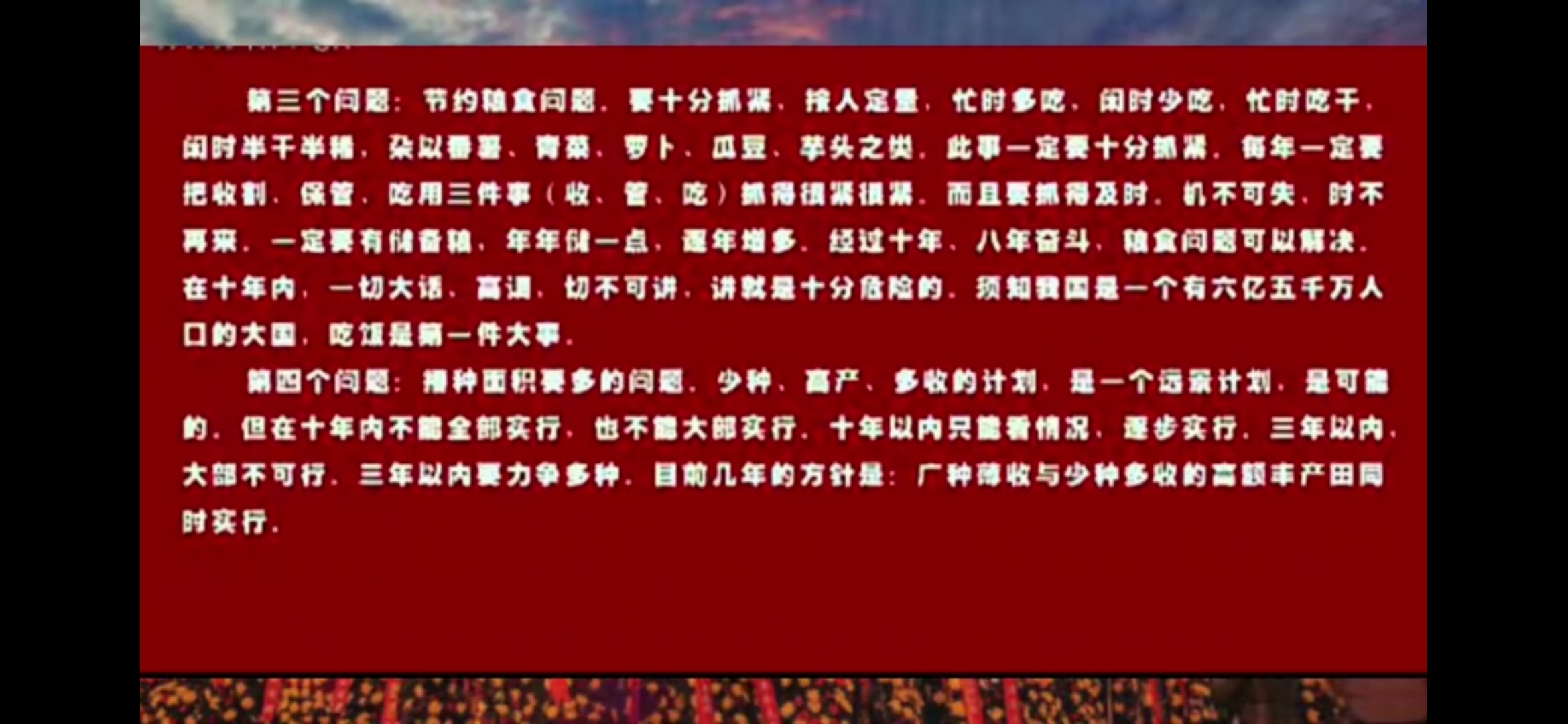 第二個問題:密植問題。不可太稀,不可太密。許多青年幹部和基些上級機關缺少經驗,一個勁要密,有些人竟説愈密愈好。不對。老年懷疑,中年也有懷疑的。這三種人開一個會得出一個適當密度,那就好了。既然要包產,密植問題就得由生產隊、生產小隊商量決定,上面死硬的密植命令,不但無用,而且害人不淺。因此,根本不要下達這種死硬的命令,省委可以規定一個密植的幅度,不當作命令下達,只給下圖參考。第三個問題:節約糧食問題。要十分抓緊,按人定量,忙時多吃、閉時少吃,忙時吃幹,閉時半乾半稀,雜以番薯、青菜、羅卜、瓜豆、草頭之類,此事一定要十分抓緊,每年一定要把收割,保管、吃用三件事(收、管、吃)抓得很緊很緊,而且要抓得及時,機不可失,時不再來,一定要有儲備糧,年年儲一點,逐年增多、經過十年、八年奮鬥,糧食問題可以解決。在十年內,一切大話、高調,切不可講,講就是十分危險的,須知我國是一個有六億五千萬人口的大國,吃飯是第一件大事。