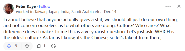 我不相信有人真的關心這個問題,我們都應該做自己的事情,而不是關心別人在做什麼。文化?誰在乎呢?這有什麼區別?對我來説,這是一個非常種族主義的問題。我們就問一下,哪種文化是最古老的?據我所知,是中國人,所以讓我們從那裏開始。