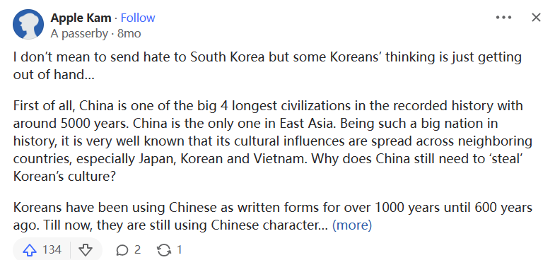 談到他們的軟實力,這些都是非常獨特的,源自於韓國的Kpop在很大程度上是基於西方尤其是黑人音樂。它的體系遵循Jpop,只是重新發展了。K-drama是現代的產物。網絡漫畫是日本漫畫的韓國版。即使是他們的民族驕傲BTS仍然被稱為"some Chinese boys”。我想説的是,韓國人從別人那裏學到了東西,並以他們自己的方式發展,併成功地使它們廣為人知甚至更好。就像他們如何將中國文化和影響融入到今天的韓國。然而,説中國人偷了他們的歷史和文化是一個很大的錯誤。中國人也應該表現出尊重,消除我們的極端自豪感,並保持謙遜。我們也是韓國現代文化的大消費者,我們也喜歡它。