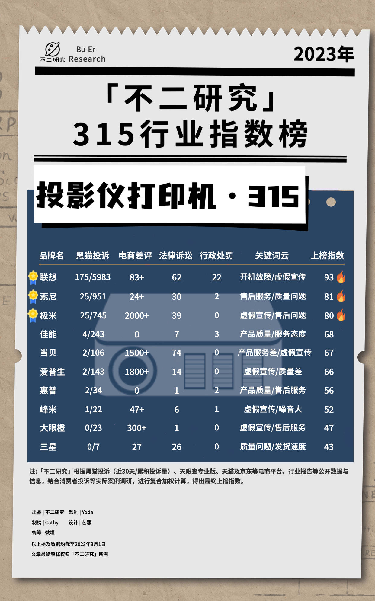 在投影儀打印機品類,「不二研究」調研了近50個活躍品牌樣本,其中聯想、索尼、極米、佳能、當貝、愛普生、惠普、峯米、大眼橙、三星10個品牌的上榜指數較高。以上榜指數最高的聯想投影儀為例,其最嚴重的問題為開機故障和虛假宣傳。