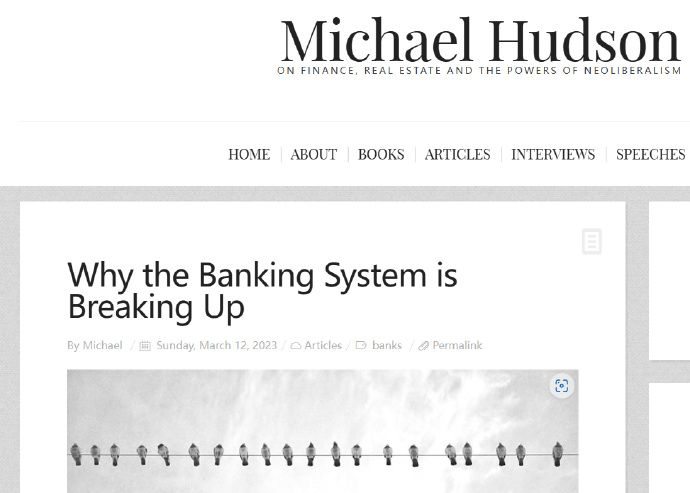 1. Michael Hudson深入分析了美國金融體系,指出了美聯儲加息導致銀行倒閉的作用機制。雖然硅谷銀行等倒閉的銀行,被美聯儲連夜開會兜底了,表面上壓下去了,但是真正的危機隨時發作。