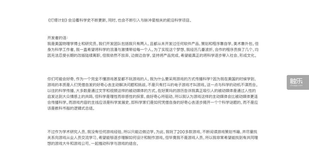 在最初,《燈塔計劃》並不叫“互動科學App”,鄧博士稱它為一款遊戲——儘管不那麼純粹,也還是遊戲。在遊戲的商店頁面裏,他曾經寫道:“……作為美國物理學博士的我,沒有任何遊戲經驗。我只是想用遊戲的方式讓大眾體驗科學。”