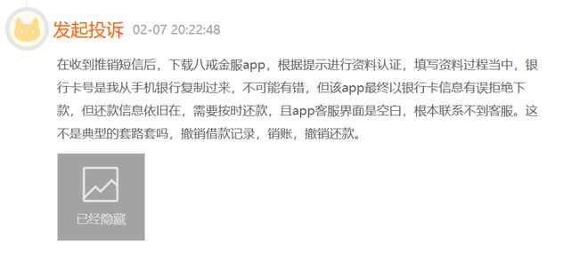 顯然,這位用户就這樣不明不白的就被收取了69元。2月9日,還有一位用户投訴稱,其下載八戒金服app,根據提示進行資料認證,填寫資料過程當中,銀行卡號是我從手機銀行復制過來,不可能有錯,但該app最終以銀行卡信息有誤拒絕下款,但還款信息依舊在,需要按時還款,且app客服界面是空白,根本聯繫不到客服。