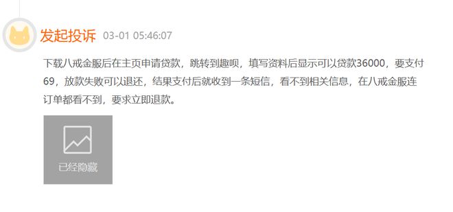 在黑貓投訴平台上,亦有不少用户投訴八戒金服涉嫌騙取會員費、給非法軟件導流、騙取個人信息不放款等等。比如3月1日,有用户投訴稱,其下載八戒金服後在主頁申請貸款,跳轉到趣唄,填寫資料後顯示可以貸款36000,要支付69,放款失敗可以退還,結果支付後就收到一條短信,看不到相關信息,在八戒金服連訂單都看不到。