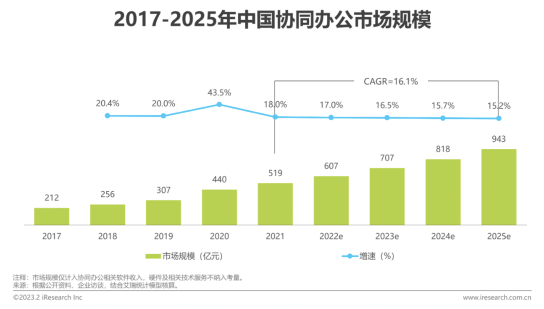 根據艾瑞近期發佈的《2023年協同辦公行業研究報告》,2023年中國協同OA辦公市場規模將突破700億元大關,2024年達到818億元,2025年達到943億元,2021年~2025年複合年均增長率為16.1%。