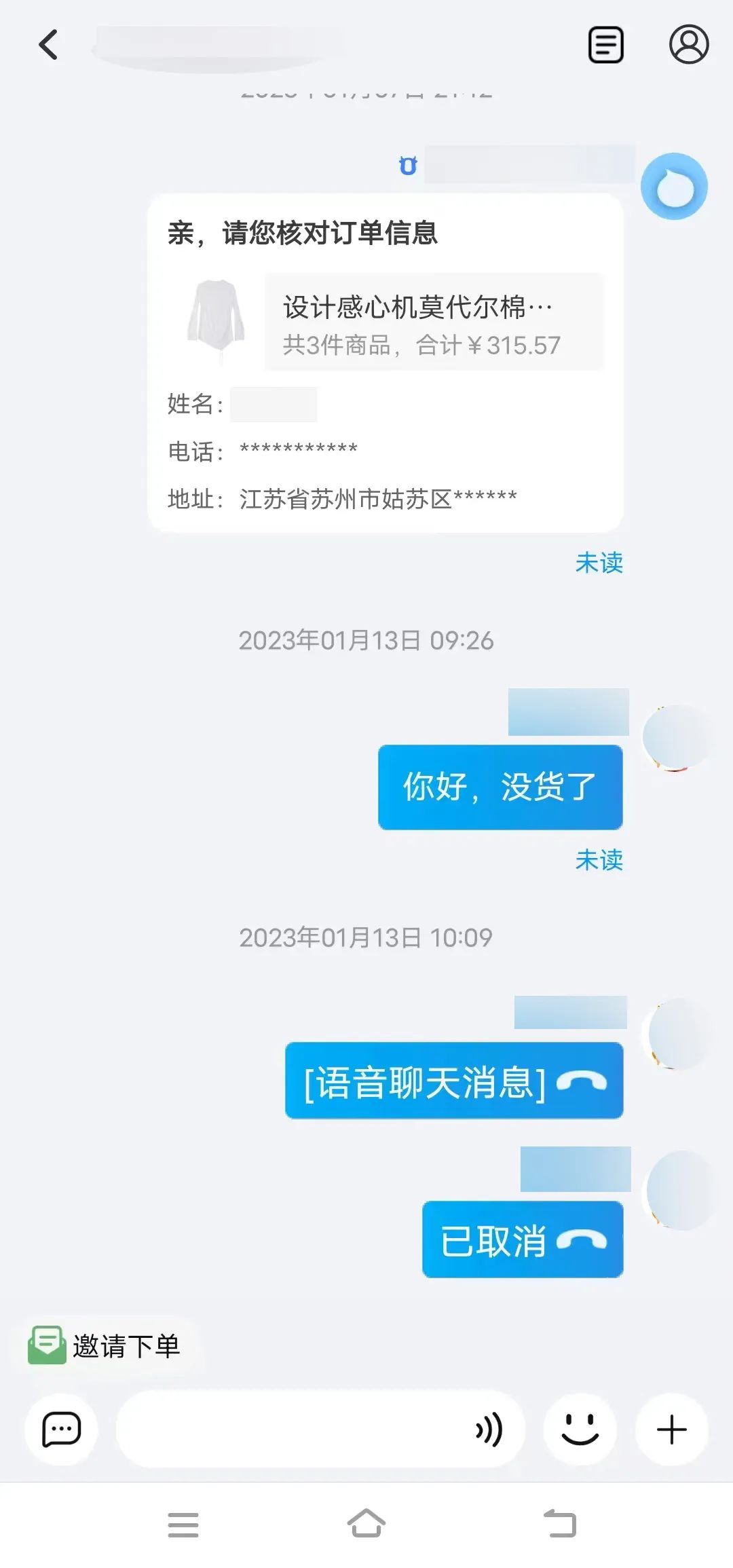 熊女士向《IT時報》記者展示了店鋪內的2筆訂單信息,訂單顯示在2022年11月20日和2023年1月13日,同一個用户使用了相同的電話號碼以及不同的收貨地址下單了6件商品,但由於該商品庫存僅剩1件,熊女士隨即在後台聯繫了該用户,希望對方退款或者減少數量,但該名用户始終沒有回覆。隨後,熊女士多次致電該用户,始終無人接聽。幾天後,熊女士便收到了千牛App發來的短信,稱其存在延遲發貨行為,需賠付一定的保證金給到消費者。