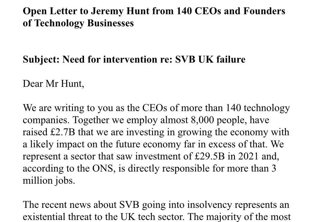 3月13日,大約180個英國科技公司聯名致信英國財政大臣傑里米·亨特,要求英國政府對此進行干預。亨特也與英國央行行長召開了緊急會議,討論如何處理可能到來的連鎖反應。英國財政部正在與部分英國的科技初創公司進行調查。