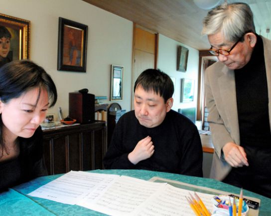 ·2007年4月6日,大江光(中)與大江健三郎(右)在一起探討歌詞譜寫。