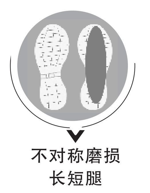 如果雙腳的鞋底磨損不對稱,主要見於雙下肢不等長。無論結構性還是功能性的長短腿都會造成下肢生物力的不平衡,在行走過程中出現雙腿受力不均勻,導致一側受力多、一側受力少,或者出現同側同向性的磨損。