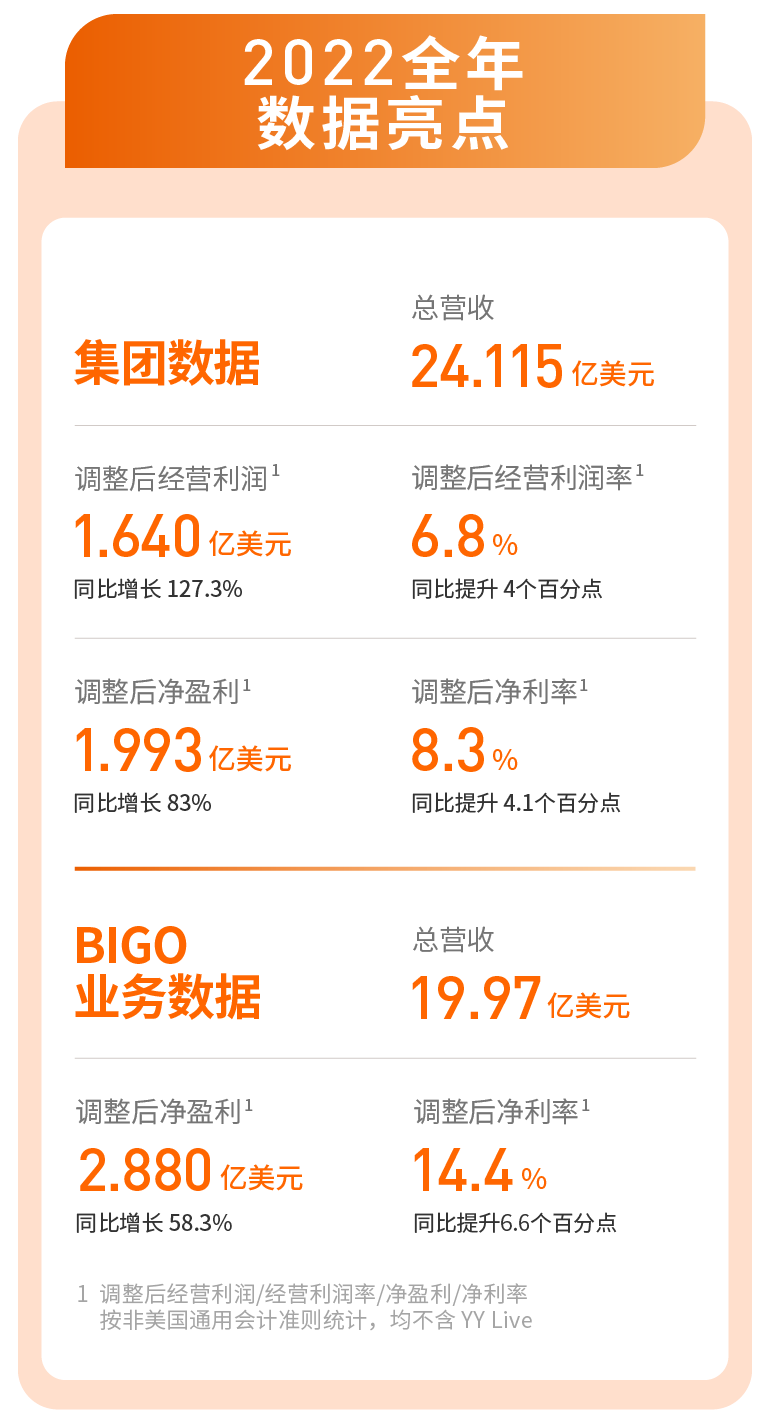 在非美國通用會計準則下(不考慮已剝離的YY Live業務),集團全年淨利潤1.993億美元,同比增長83%,淨利率達8.3%;BIGO板塊全年淨利潤2.88億美元,同比增長58.3%,淨利率達14.4%。繼2021年後,歡聚集團連續第二年實現全年盈利。集團旗艦產品Bigo Live用户增長提速,MAU同比增長14.3%。