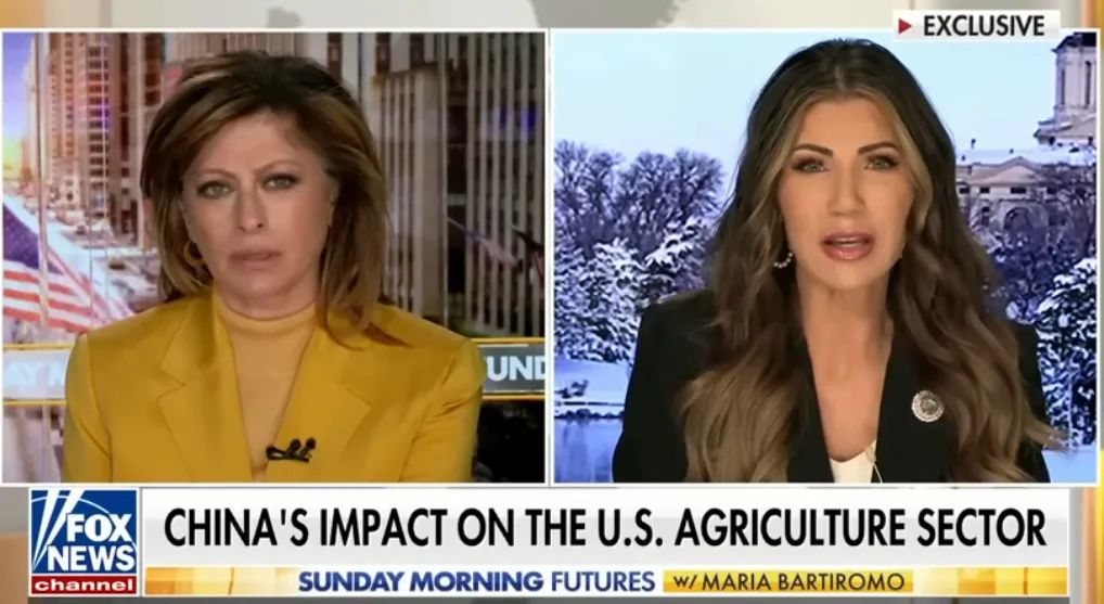 美東時間12日,克里斯蒂·諾姆出現在福克斯新聞“Sunday Morning Futures”節目中,大談中資企業購買美國農地“令人擔憂”,還搬出美國國家安全受到中國“廣泛威脅”那套陳詞濫調,並誣稱中國正利用一切可能的手段和工具監視美國。
