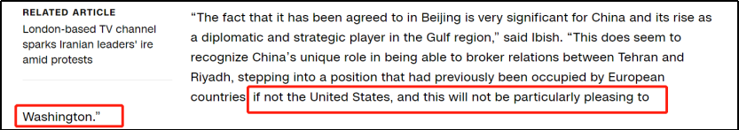 不過這還沒完,還是3月13日當天,強力輸出的紐約時報當天又發表了一篇關於中國促成沙特伊朗恢復外交的文章,這裏面的酸味兒就更濃了。