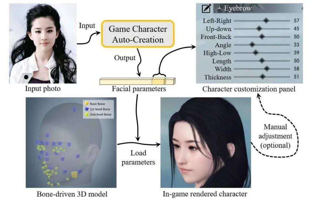 網易的AI實驗室“伏羲”也最早於2017年上線,主攻AI在遊戲與泛娛樂當中的應用研究。如今伏羲在NPC行為、語音、美術等方面已經運用於網易旗下多款遊戲之中。如上文中提到的米哈遊“AI配音”功能,網易也通過伏羲在自己的遊戲《時空中的繪旅人》中實現。而在3月14日,伏羲又宣佈其“文本捏臉創建角色”相關論文入選CVPR接收名單,並已應用於多款手遊。