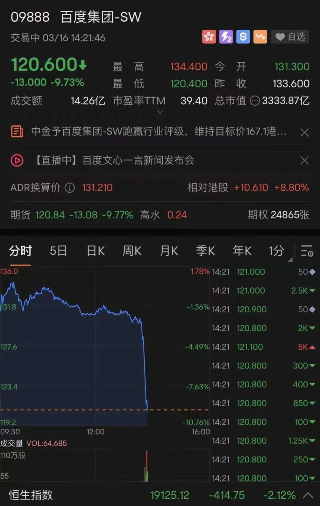 然而,市場似乎很看好文心一言的前景,發佈會舉行時,百度的股價顛簸,尾盤拉昇。