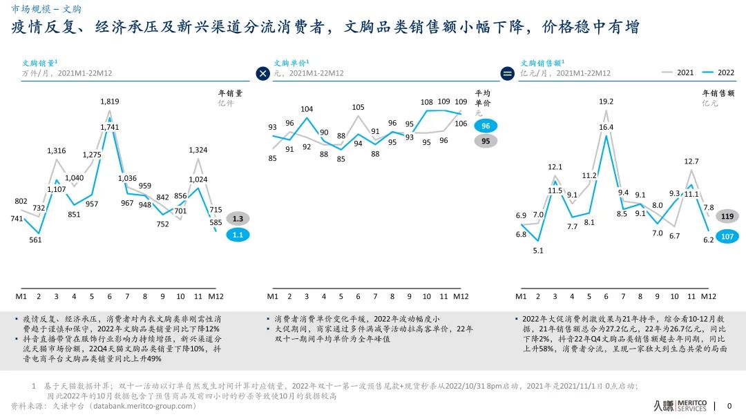 疫情反覆、經濟承壓,文胸品類較服飾品類韌性強,2022年文胸品類銷售表現優於服飾品類整體(22年天貓文胸品類銷售額同比-10% vs 服裝配飾品類銷售額同比-24%,22年文胸品類銷量同比-12% vs 服裝配飾品類銷量同比-27%),抖音直播帶貨在服飾行業影響力持續增強,分流天貓市場份額,22年Q4天貓文胸品類銷量下降10%,抖音文胸品類銷量同比上升49%