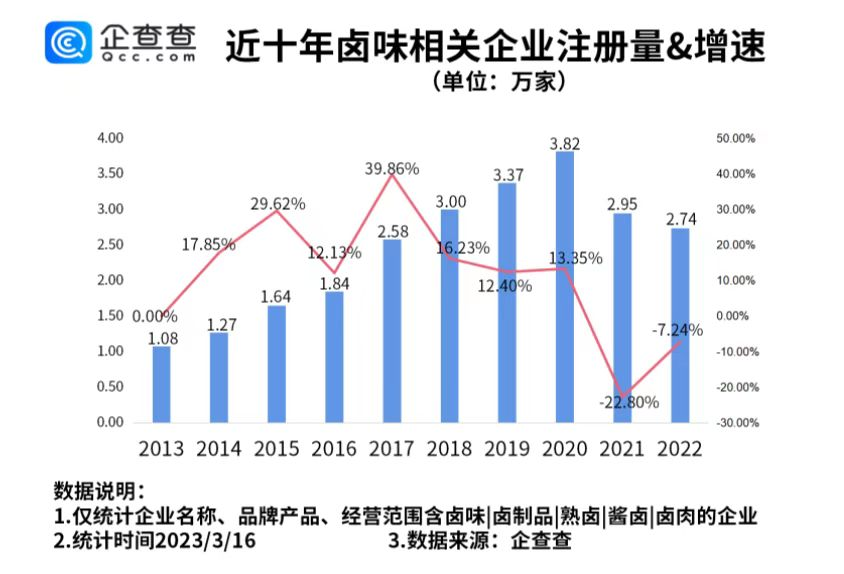 而滷味相關企業的註冊數據,也在佐證行業受熱捧程度。企查查數據顯示,我國現存滷味相關企業18.45萬家。且在2020年之前,滷味行業每年相關企業的註冊量同比增速都在10%以上,2022年行業企業新增註冊量為2.74萬家,同比增速明顯回升。