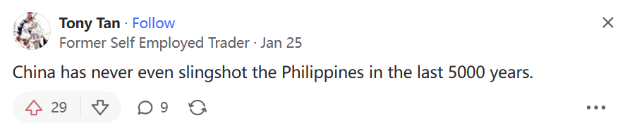 在過去的五千年裏,中國甚至從未用彈弓射過菲律賓。