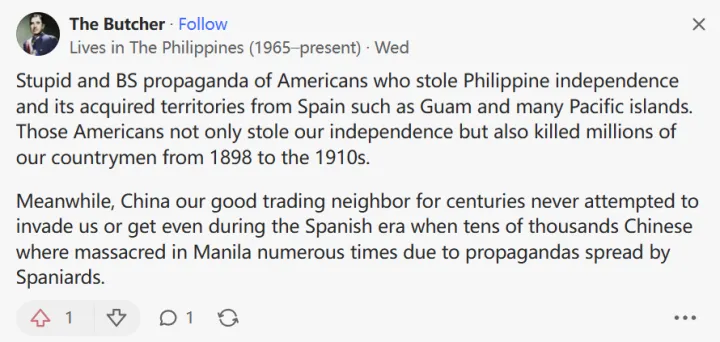 竊取菲律賓獨立及其從西班牙獲得的領土(如關島和許多太平洋島嶼)的美國人的愚蠢和BS宣傳。這些美國人不僅竊取了我們的獨立,而且還在1898年至1910年代期間殺害了我們數百萬的同胞。