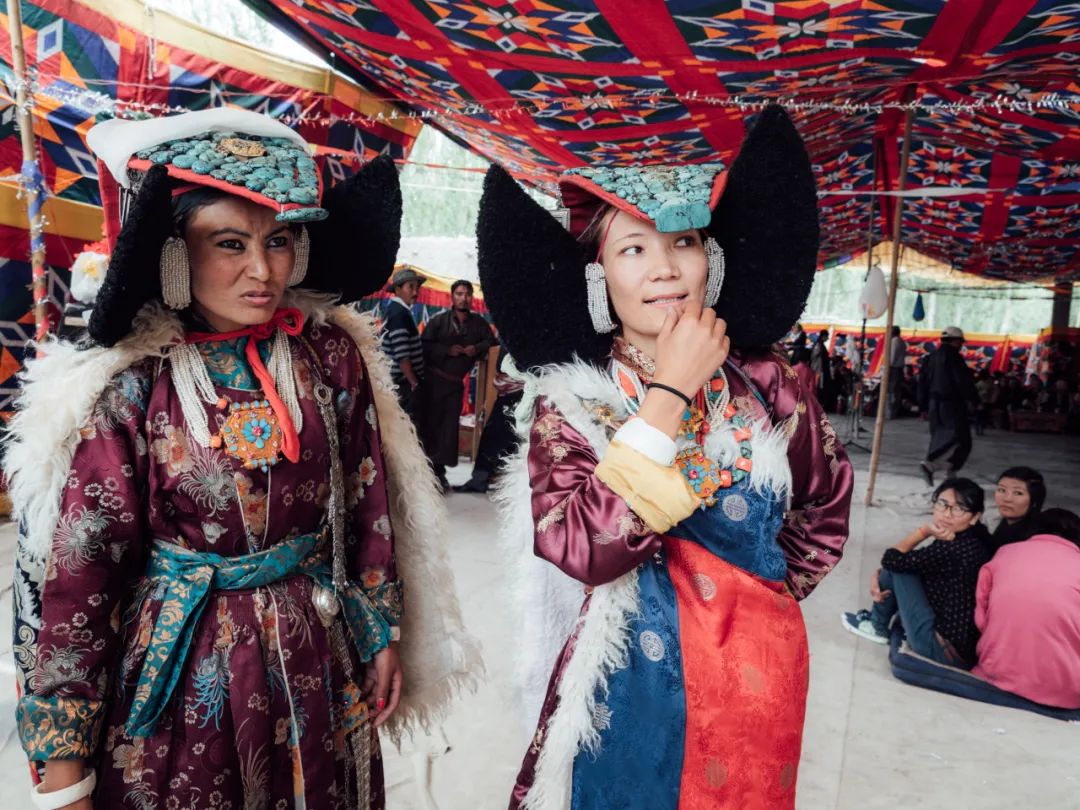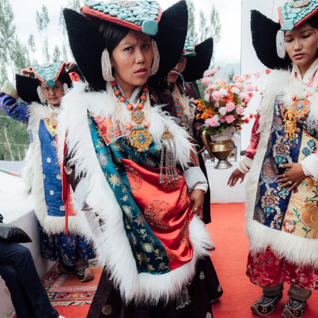 我們從提賽寺才開出來幾百米,剛繞到寺廟背後,突然看到路邊有好幾個身穿拉達克傳統盛裝的女孩。她們頭上戴着綴滿綠松石的巨大頭飾,胸前戴着鑲嵌有寶石的金銀嘎烏盒,肩上披着羊皮襖子,腳上穿着不分左右腳的傳統藏靴——這個具有視覺衝擊力的場面當時就把我驚呆了,畢竟那是我第二次到拉達克、第一次見到盛裝打扮的拉達克人,更沒有預期她們會就這樣出現在大馬路邊上。