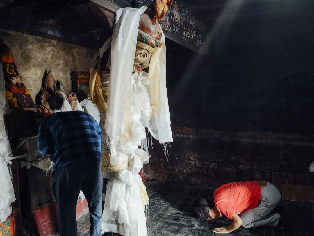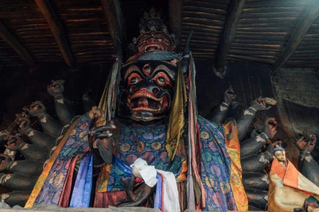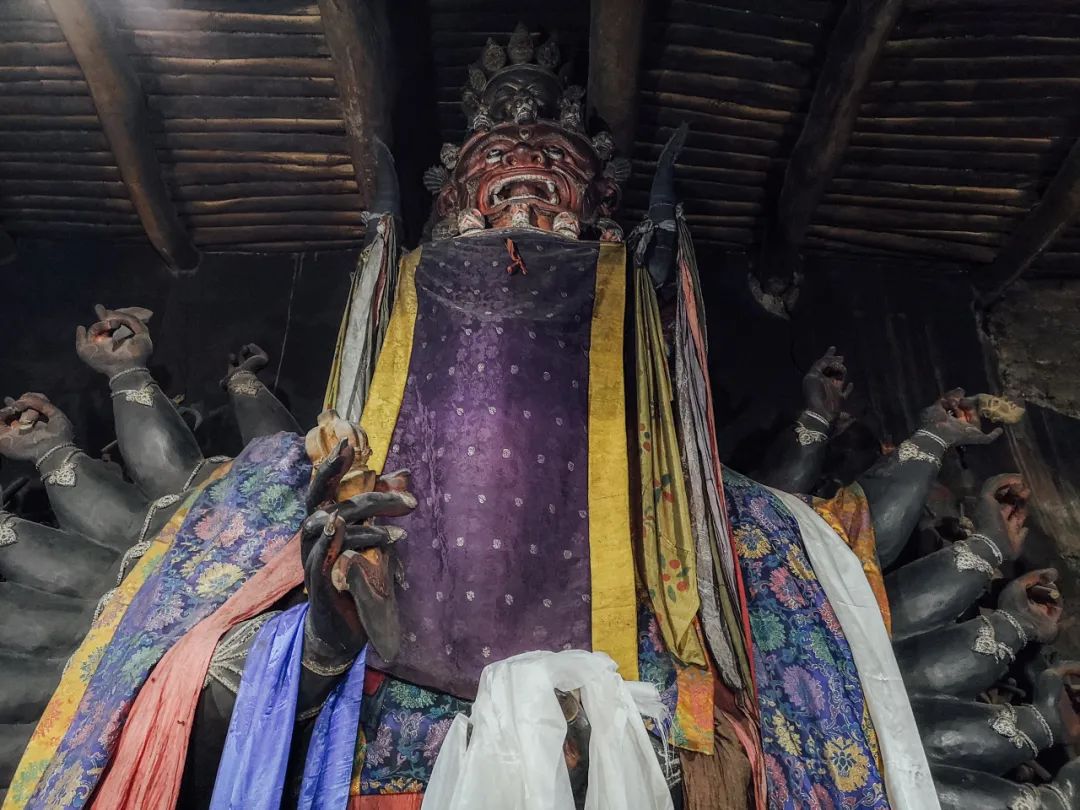 而對當地人而言,提賽寺最為重要的是護法殿,包括我太太一家在內的附近村民都對護法殿中的吉祥天母(Paldan Lhamo)非常信奉,將其視為他們這個地區的守護神。提賽寺的護法殿是整座寺廟最古老的部分之一,殿內的燈光十分昏暗,牆壁上的壁畫被經年累月的香火燻成了黑色,難以辨別細節。這裏最醒目的是一尊用泥胎製作的高大而又細緻的大威德金剛(Vajrabhairava)護法造像,這些護法造像並不像其他造像那樣被放置在高高的台座上,而是落在地上接着地氣,朝拜的信徒可以直接觸摸護法得到加持。護法殿裏的那幾尊泥胎護法神已然被摸出了厚重的包漿,看起來幾乎和地面融為一體。