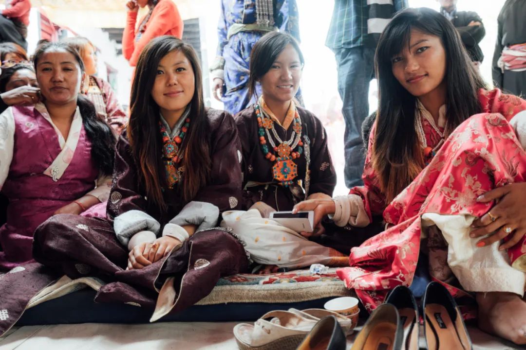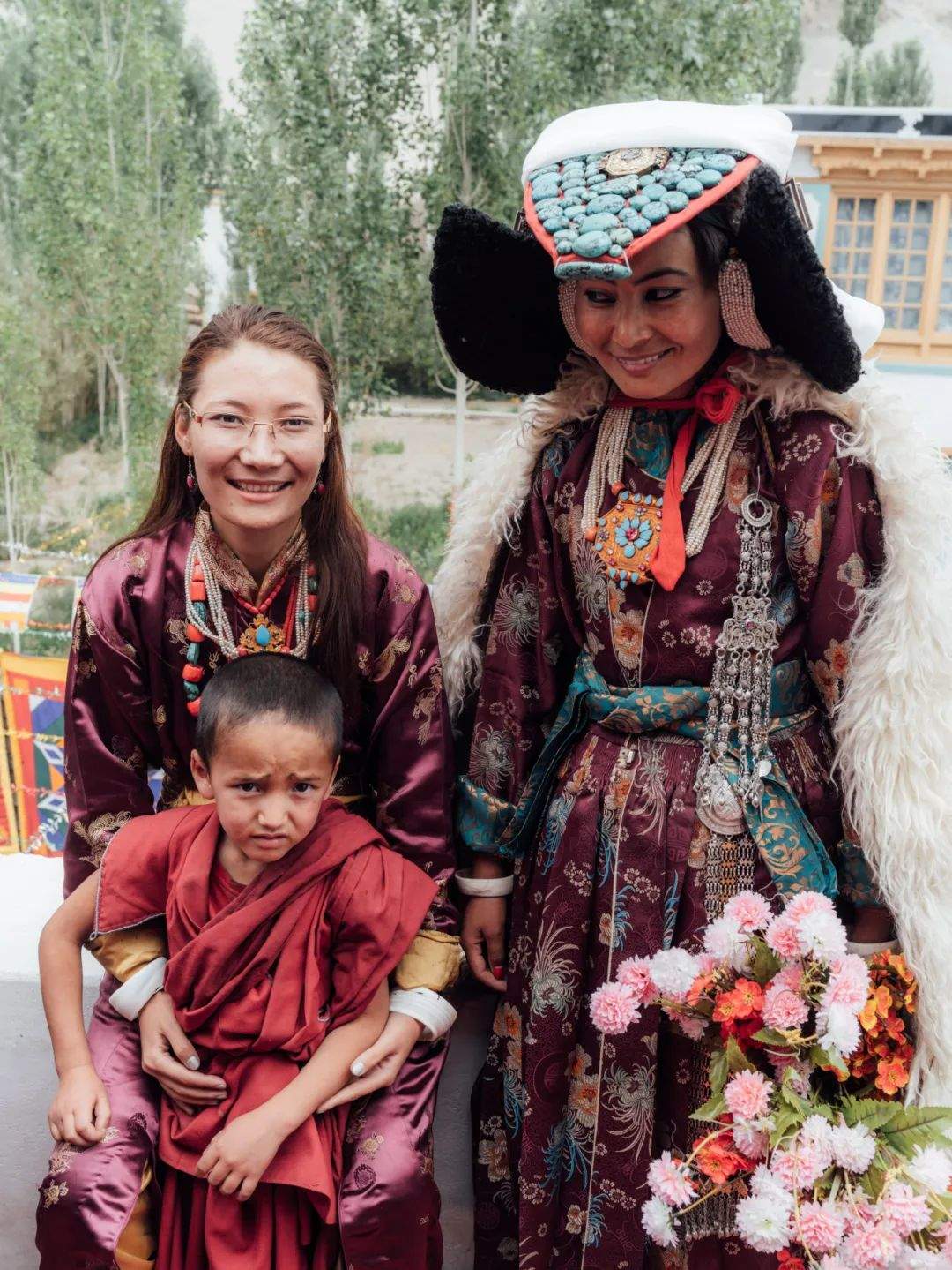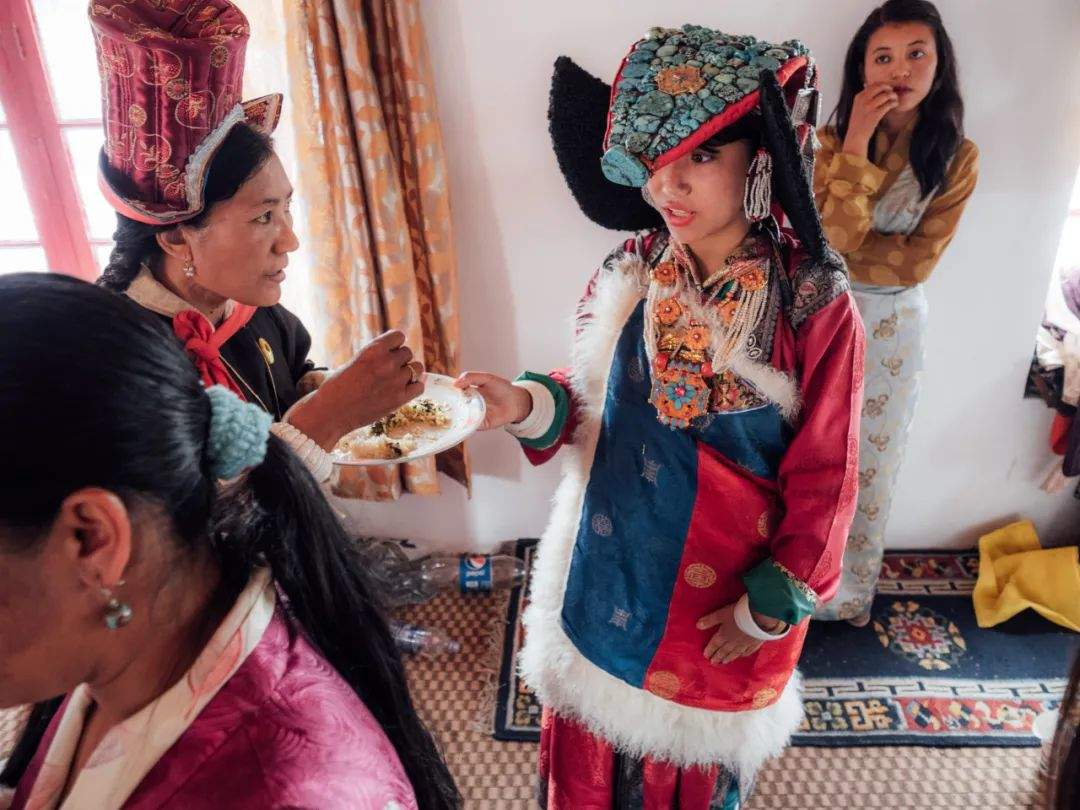 當看到這個女孩摘掉眼鏡、戴上綠松石頭飾之後,我的直觀感受是——她那種偏歐美系的混血長相與這身裝束並不般配,感覺好像是借了一套服裝在玩cosplay。而現場的其他幾位“典型拉達克女孩”穿上自己的傳統服裝後,則毫無違和感。