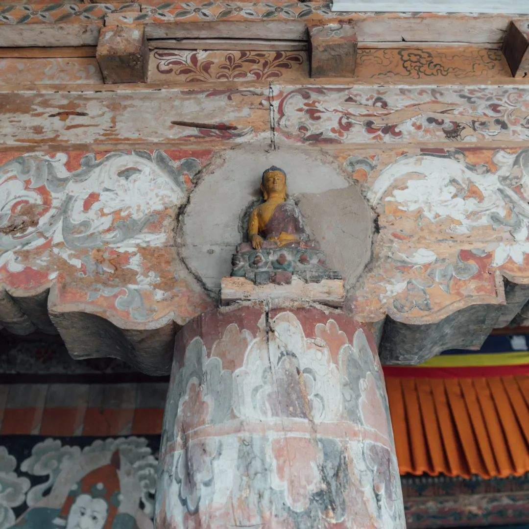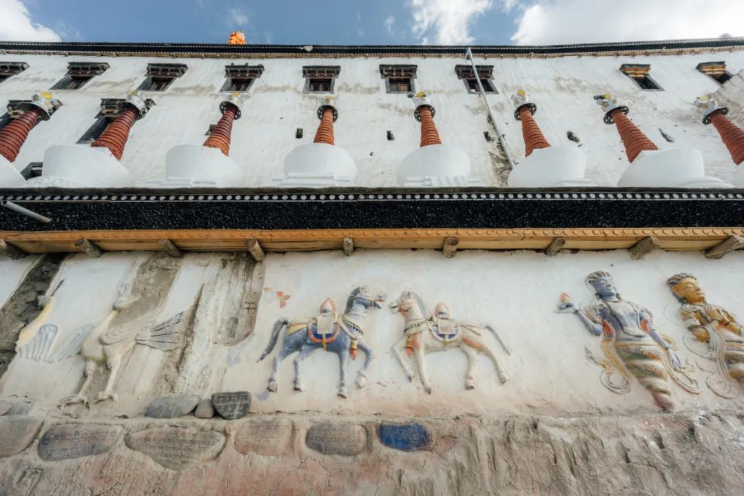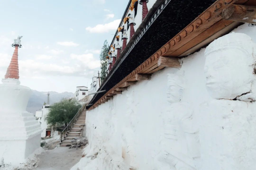 我在之前章節講到列城老城和拉隆寺時就提到過,類似的“破壞性維護”現象在拉達克可謂司空見慣。我見過很多白塔基座原本都帶有彩繪浮雕,由於簡單粗暴的粉刷、修復,先是彩繪沒了,時間久了之後浮雕也就沒了……拉達克大量的宗教藝術品都是被這樣漫不經心的“維護”給毀壞的。我突然覺得,從修持佛法的角度來講,可能這反而才是符合佛法教義的心態——不去執着於事物外在的“相”。世界註定要歷經成壞住空各種劫難,就算再怎麼精心維護修復,難道這些泥胎彩畫就能永恆不壞?造佛像、修佛塔的目的是為了表達對佛法的恭敬,只要對佛法的恭敬心不壞,那些外在有形的事物實在很次要。正因為我們的庸俗、着相,才會對此感到可惜;真正領悟了佛法的超脱之人,恐怕不會去在意“相”的崩壞——本來無一物,何處惹塵埃?