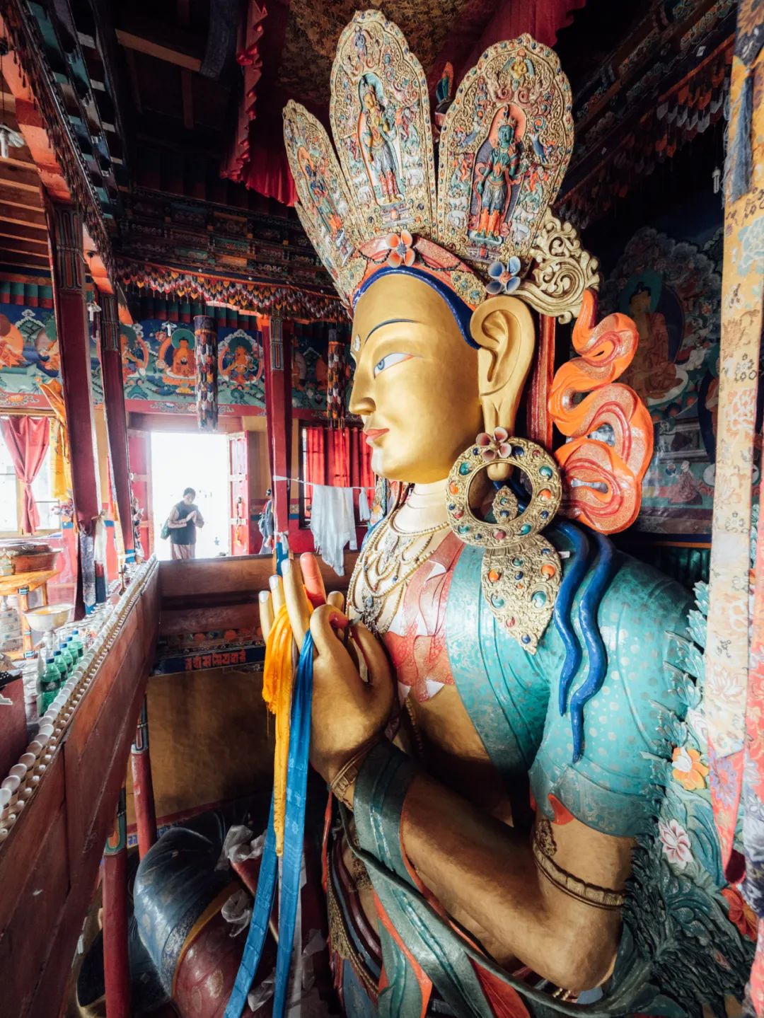 對大多數遊客而言,提賽寺最值得一看的是彌勒殿,殿中彌勒造像高達15米,是拉達克地區最大的室內彌勒造像,比這座彌勒更高的是利基寺和迪斯基特的露天彌勒。這三座彌勒都修建於近代,越新的造像建得越高,由此可以反映近年來拉達克人確實越來越有錢,工程技術水平也在不斷提高——32米高的迪斯基特彌勒落成於2010年,23米高的利基寺彌勒完工於1997年,15米高的提賽寺彌勒則是在1980年由大海喇嘛親自開光的。據説修建這尊彌勒像的目的,是為了紀念1970年大海喇嘛對提賽寺的訪問。
