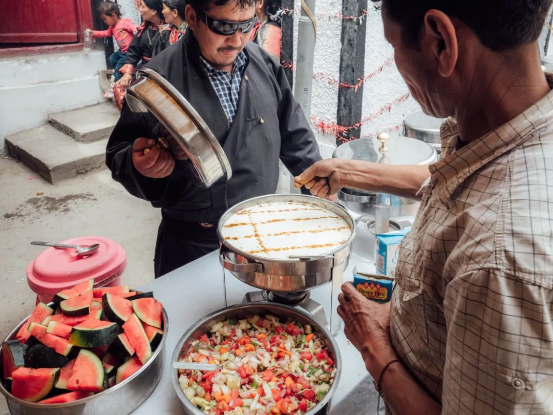 那天午餐提供的是“印度式自助餐”——這裏我又要簡單説明一下——包括拉達克在內的印度人搞家庭聚餐,都是自己去大鍋裏盛,會嚴格避免食物的交叉污染。因為印度人實在有着太多種不同的忌口,一不小心就可能冒犯人家的禁忌,最保險的方法便是讓每個人自己盛取。但他們的這種聚餐跟我們國內的自助餐還是蠻不一樣的——首先,聚餐上提供的食物品種很有限,通常最多五六個菜,以吃米飯為主,葷菜一般不超過2個,奶豆腐(Paneer)和雞蛋也算葷菜。比方説我們那天的活動是佛堂開光齋僧,自然沒有任何肉食,便是用雞蛋和奶豆腐替代。其次,原則上每個人只會取一次食物,大家都端着盤子排着隊打飯,自己吃什麼盛什麼、吃多少盛多少,反正吃來吃去就那麼幾種東西,不存在“我先嚐一下這個好不好吃”之類的情況。當然,你吃完之後覺得沒飽,想要再去添也是可以的。