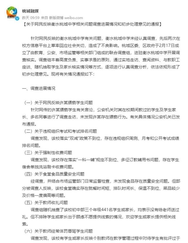 2022年2月關於桃城中學的官方通報,圖源:桃城融媒官方微博