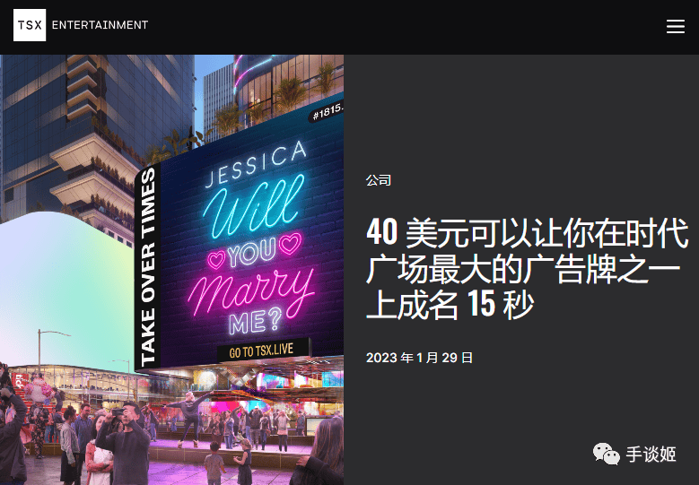 TSX的活動並不是件壞事,它至少給普通人提供了更多價位段的選擇。在此之前,時代廣場廣告牌的其他代理商也有着“通過廣告牌求婚”的項目,10分鐘,6個廣告牌,售價3499美元。