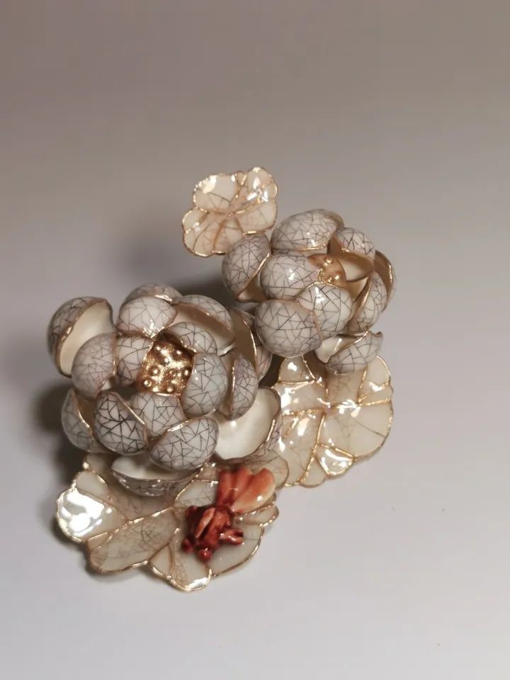 這些荷花、牡丹、海棠等簪花飾品,透着陶瓷、貝雕、點翠、玉石的質感,甚至連冰裂紋都清晰可見。
