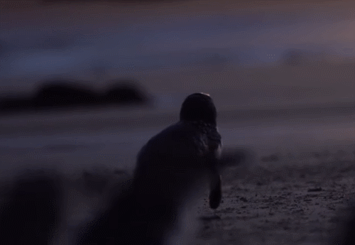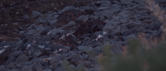 終於,夕陽西下,暮色四合,小藍企鵝白亮的肚皮出現在波濤之中。面朝沙灘,背對大海,搖搖擺擺地穿過沙地,艱難地爬過亂石灘。像以往無數個夜晚一樣,它們回來了。