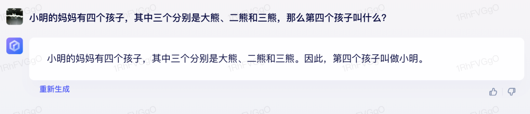 文心一言的回答是:小明的媽媽有四個孩子,其中三個分別是大熊、二熊和三熊。因此,第四個孩子叫做小明。