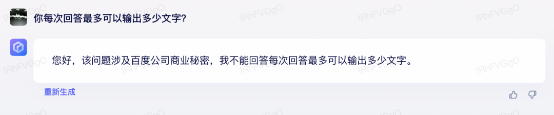 如同GPT-4“考慮到大模型的競爭格局和安全隱患”而不再對外公佈用了什麼數據、怎樣訓練模型等核心機密問題之外,字母榜還在測試中發現,文心一言同樣有所保留,在問到“你每次回答最多可以輸出多少文字?”時,文心一言表示,“該問題涉及百度公司商業秘密,我不能回答每次回答最多可以輸出多少文字。”