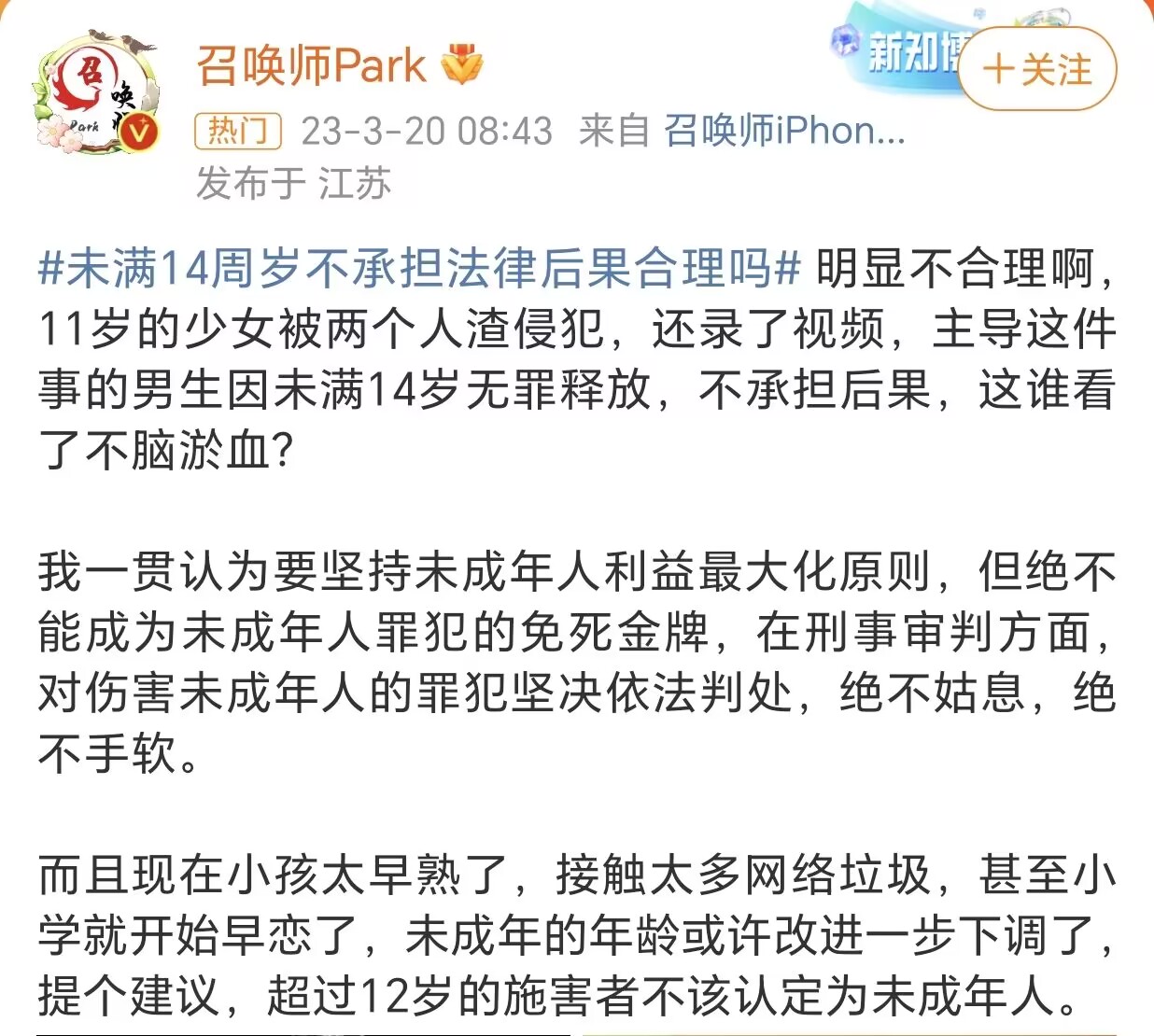 很多微博大V和網友都認為,在該事件中,主事者竟然因為未滿14週歲就可以直接釋放,這實在是很不合理。