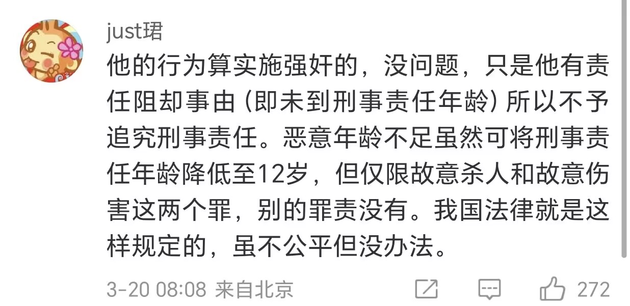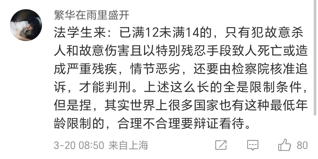 不過,也有網友解釋道,我國法律中規定,已滿12週歲未滿14週歲,犯故意殺人、故意傷害、致人死亡或以特別殘忍的手段致人重傷造成嚴重殘疾的,情節惡劣的才會負刑事責任。