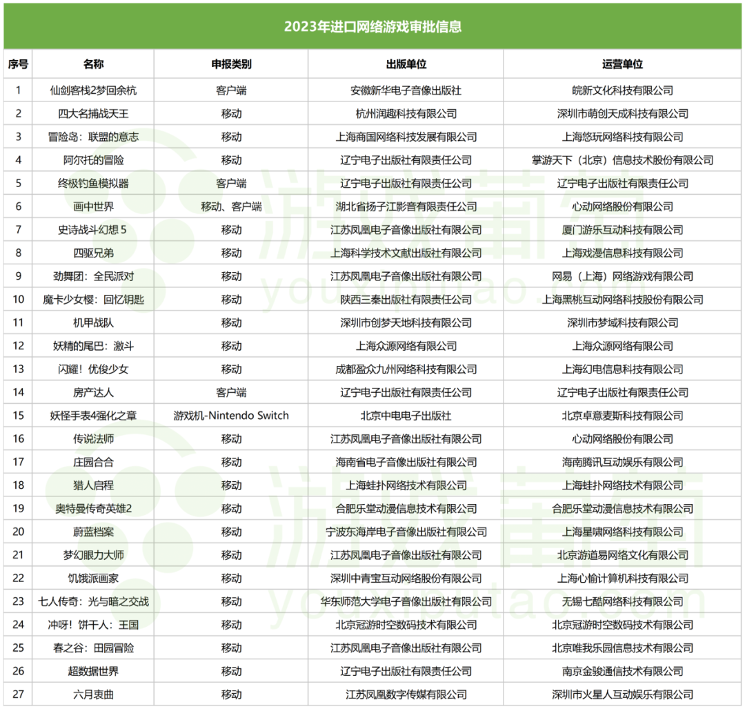3月16日晚,國家新聞出版署公佈了3月進口網絡遊戲審批信息,共有27款遊戲過審(文末附有完整名單)。