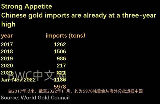 根據世界黃金協會公佈的報告顯示:從2017年至2022年11月,約有5978噸黃金從海外分批運抵中國。