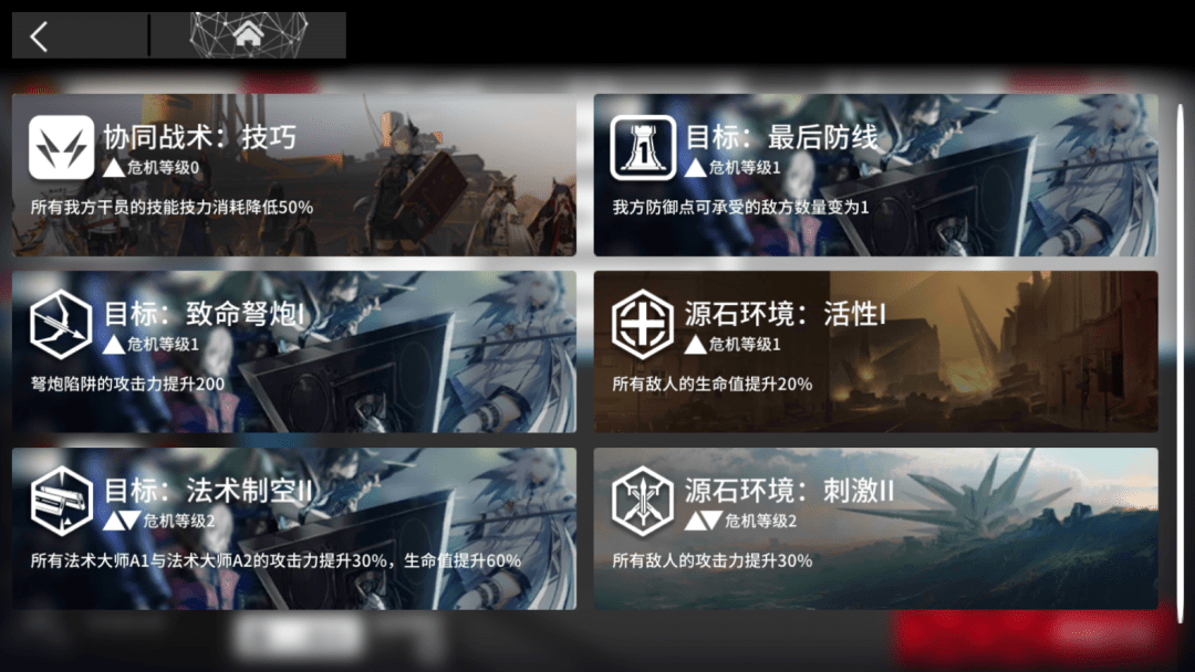 “危機合約”是《明日方舟》裏一種不消耗遊戲體力,通過搭配不同詞條的“合約”來進行不同難度的作戰,通過作戰完成相應挑戰任務,提升關卡評價獲取活動物資,兑換獎勵的活動。