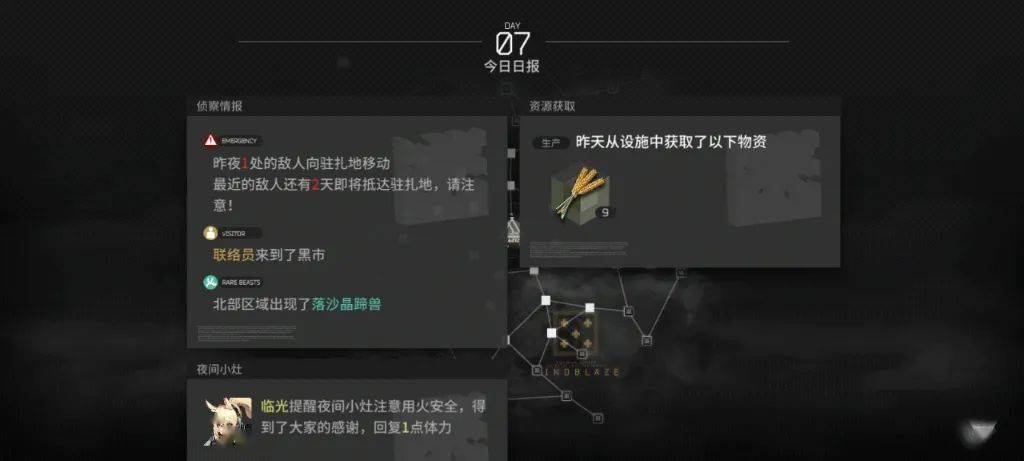 在這個活動中,玩家每天會有固定的行動點,需要玩家利用行動點進行資源收集,用食物解決幹員飢餓恢復體力,製作工具加速採集速度,對基地進行建設,遭遇隨機事件,遇見行貨商人,抵禦敵人的襲擊。
