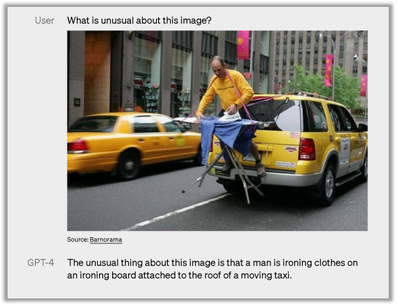 比如測試者問這張圖有什麼不尋常的地方,AI説因為這個男人在燙衣服,而燙衣服的架子被固定在一輛正在行駛的出租車上。